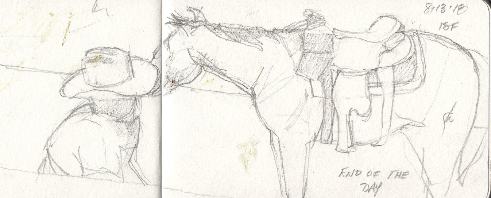 With so many large animals to manage, it's no mistake that the Fair has people to assist with animal control. Since the animals in question can be enormous, horseback wranglers are important. These folks patrol the streets around the animal barns on horseback, patiently sitting astride, smiling at children, posing for photos, answering questions, and occasionally wrangling a steer or horse that's gotten frisky. But sitting astride a horse for hours, even when the horse isn't moving, can bring on substantial soreness and fatigue. As I was leaving Monday around midday I saw this rider taking a rest from sitting the saddle, and giving the horse a rest besides. Sometimes you just have to get down. I sketched this simple scene in graphite, about 3.5x6.